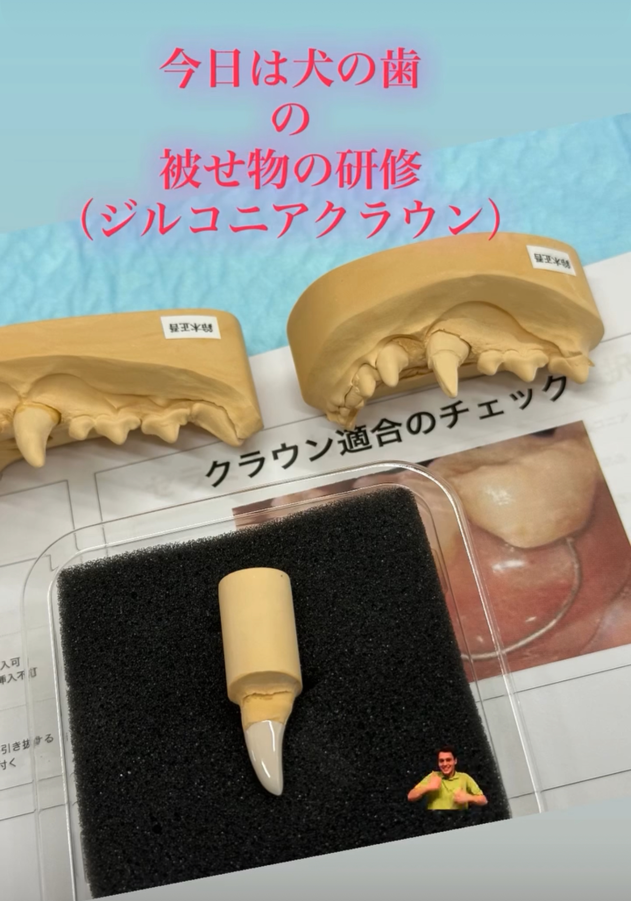 その後は歯が折れてなくなってしまったワンちゃんに対する「ポスト&クラウン」実習、更に奥歯の支台形成(被せモノの下準備)から印象取り(被せモノの型取り)を行いました。