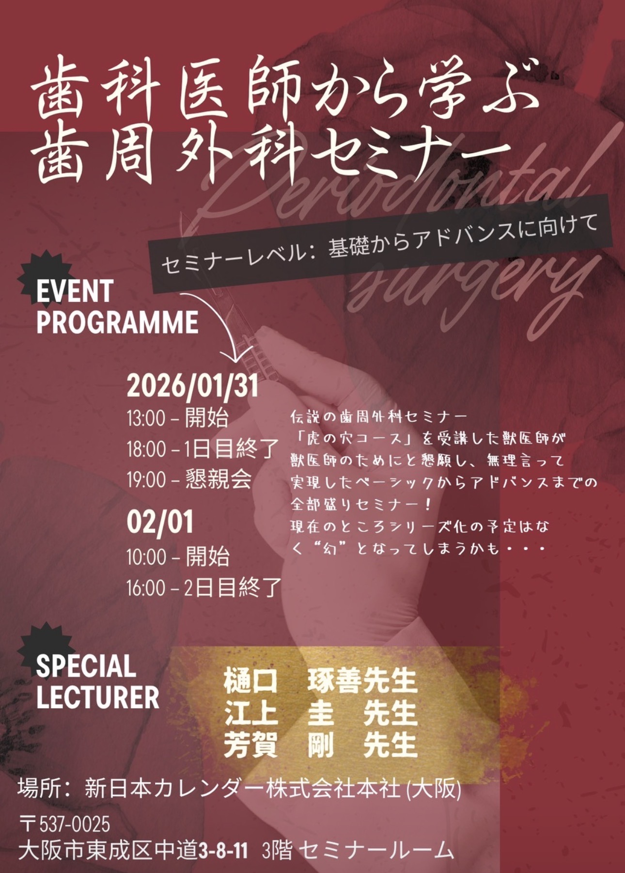 なんと今回はその分野に於ける日本のレジェンドの先生とお弟子さん達トップランナーの歯科医師の先生4名が全国から集まった約20名の獣医さんのためにだけの実習をお受け頂けました。